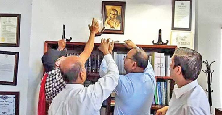 ৫ আগস্ট দুপুরে শেখ হাসিনা পদত্যাগ করে বাংলাদেশ ছেড়ে ভারতে আশ্রয় নেয়ার পর আন্দোলনরত প্রবাসী ও বিএনপি নেতাকর্মীদের চাপে ছবি নামিয়ে ফেলা হয়।