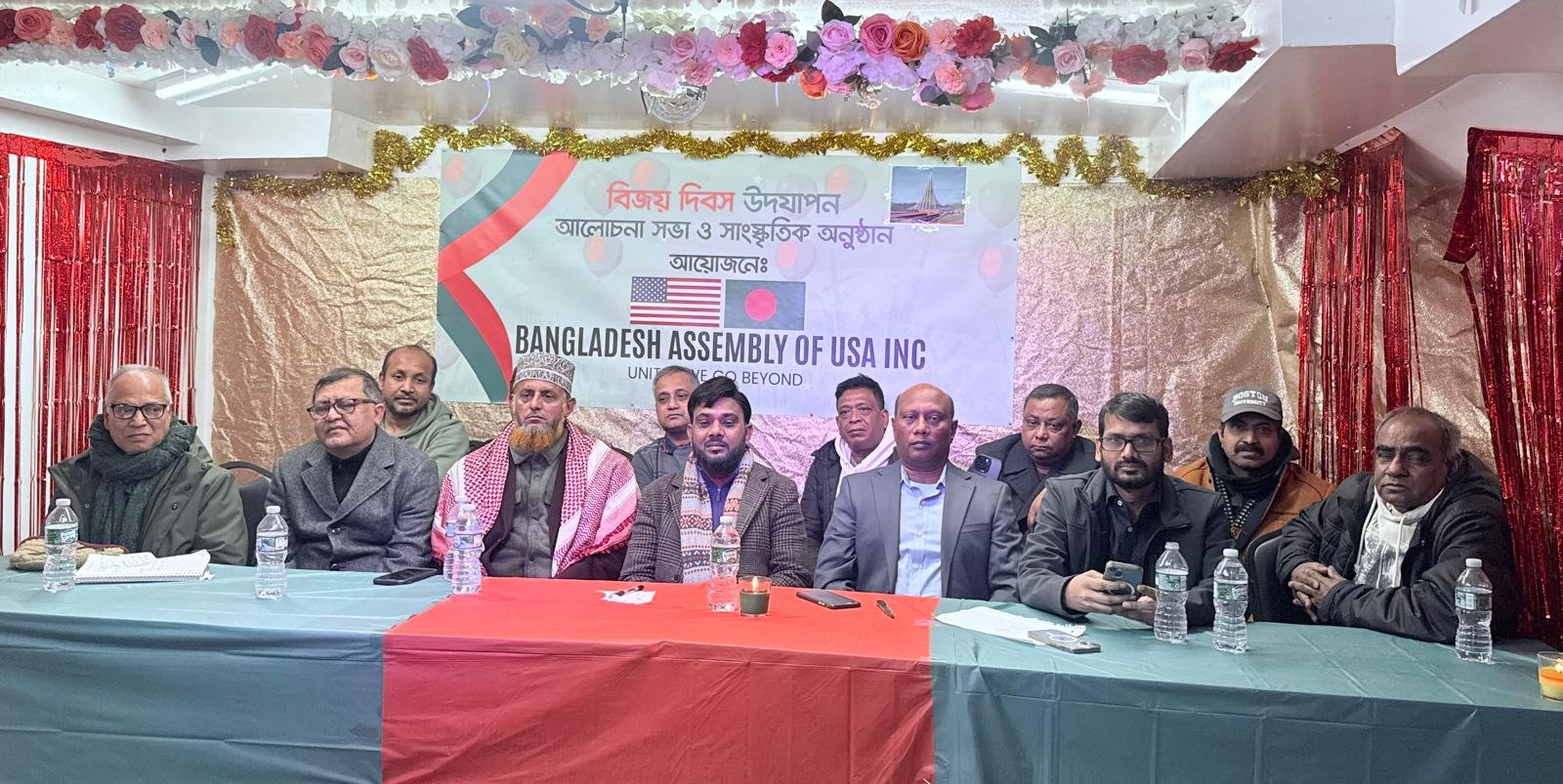 যুক্তরাষ্ট্রের বাংলাদেশি কমিউনিটির অন্যতম সংগঠন বাংলাদেশ আসেম্বলি অব ইউএসএ ইনক. মহান বিজয় দিবস উদ্যাপন উপলক্ষে এক অনন্য অনুষ্ঠান আয়োজন করেছে। গতকাল স্থানীয় সময় সন্ধ্যায় নিউ ইয়র্ক শহরের একটি কমিউনিটি সেন্টারে অনুষ্ঠিত এ আয়োজনে প্রবাসী বাংলাদেশিরা তাদের দেশপ্রেম, ঐতিহ্য এবং সংস্কৃতির প্রতি অকৃত্রিম ভালোবাসার নজির স্থাপন করেন।